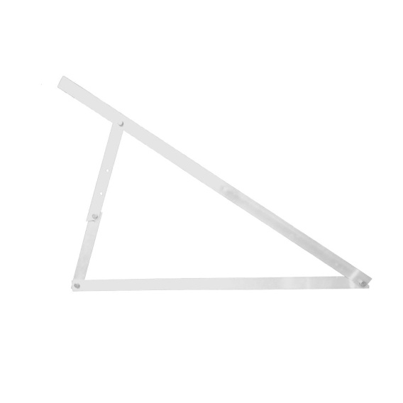 Aluminiowy trójkąt montażowy do paneli fotowoltaicznych, zapewniający regulację kąta nachylenia od 15 do 35 stopni, przeznaczony do instalacji na płaskich lub lekko nachylonych dachach. Komplet zawiera niezbędne śruby i nakrętki.