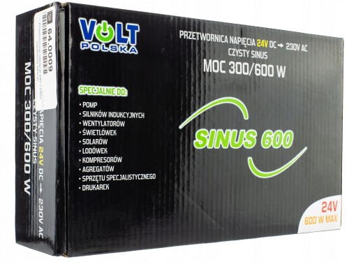 Przetwornica napięcia Sinus-600 24 V służy do zasilania urządzeń elektrycznych wymagających napięcia przemiennego 230 V z akumulatorów i instalacji samochodowych o napięciu stałym 24 V.