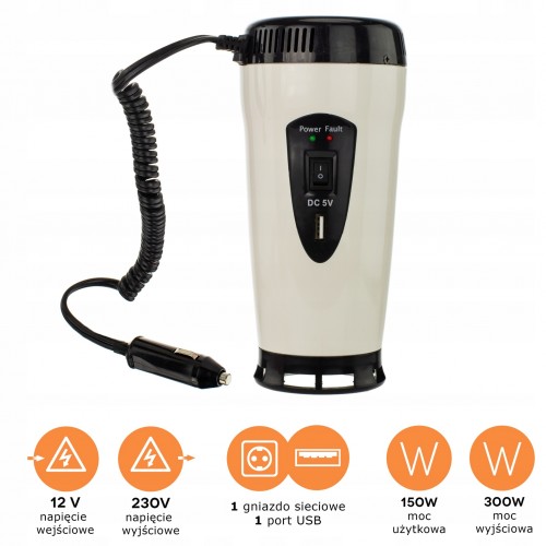 - Umożliwia używanie urządzeń 230V w samochodzie