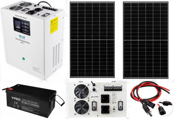Gotowy zestaw fotowoltaiczny oparty na przetwornicy solarnej SinusPRO-2200S 12V 2000VA SOLAR z wbudowanym regulatorem ładowania MPPT 60A firmy Volt Polska wraz z PANELEM SŁONECZNYM 405W, akumulatorem 200Ah, przewodami oraz końcówkami do podłączenia, tworzą jedyny w swoim rodzaju Zestaw off-grid O MOCY AŻ 2200W.